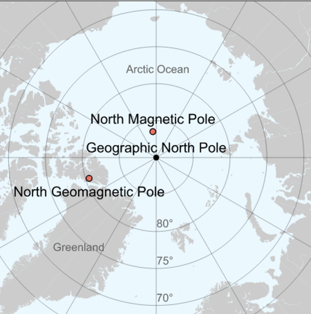Magnetic versus geomagnetic poles. Image via wikipedia, CC BY-SA